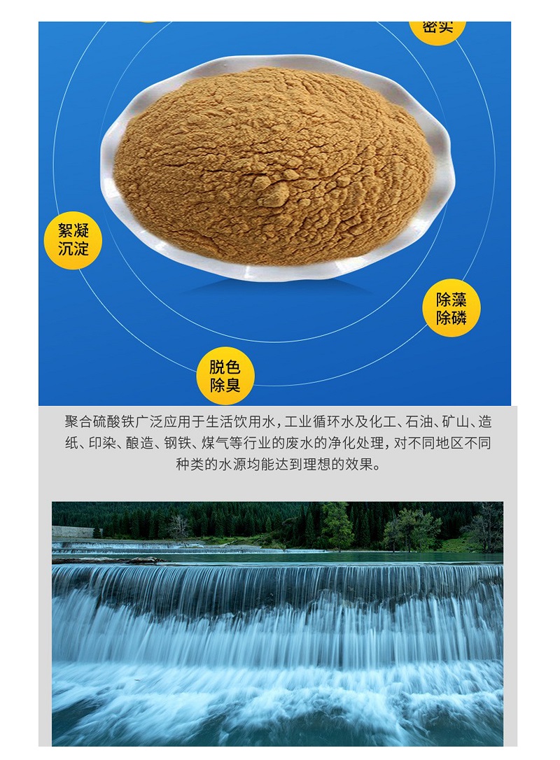 聚合硫酸鐵是一種粘稠的液體或固體,具有快速混溶、中和電荷、水解架橋、混凝沉淀和吸附作用,從而使水迅速沉清,尤其是對工業(yè)廢水和生活污水處理特殊有效。它完全可以代替堿或氯化鋁水處理劑,比堿式氯化鋁適應性大。用聚合硫酸鐵處理水質(zhì)時,耗藥量少,排污量少,處理效果好。生產(chǎn)聚合硫酸鐵原料易得,價格低廉,并可變廢為寶,是一種值得推廣的理想水處理劑。