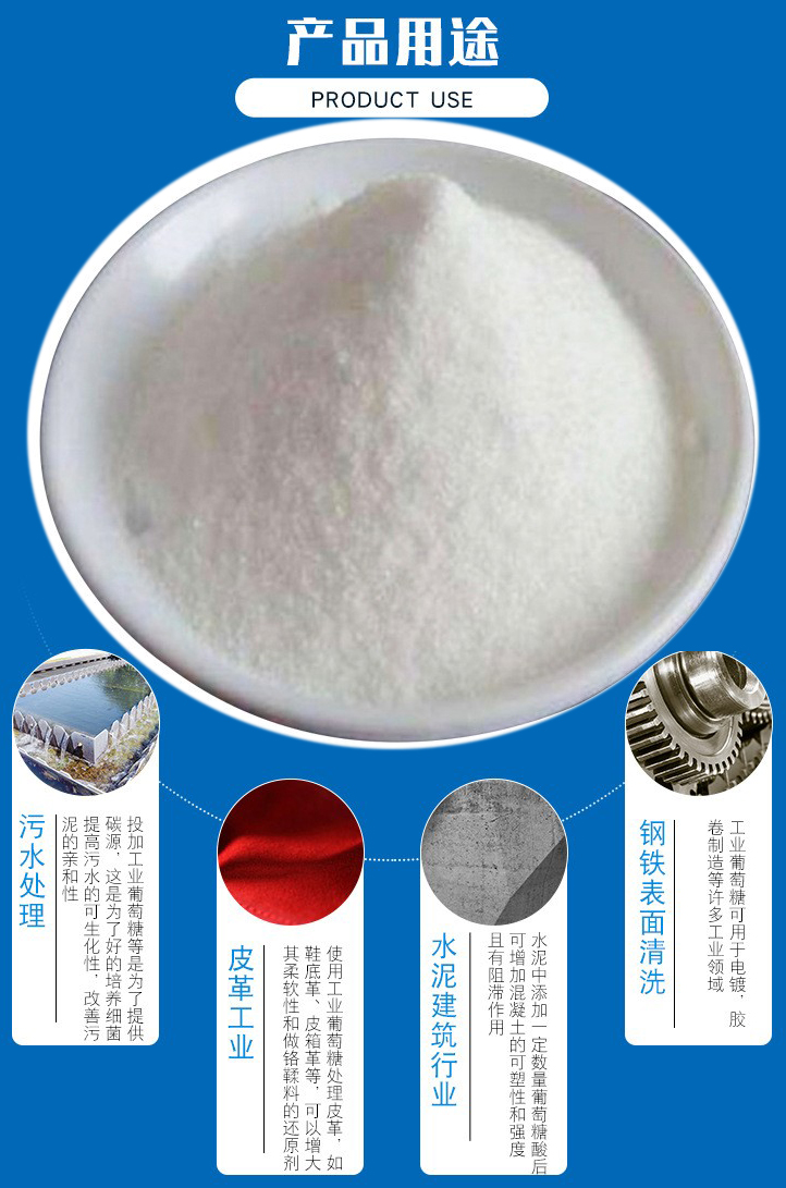 4、工業(yè)葡萄糖可以作水泥摻合劑:水泥中添加一定數(shù)量葡萄糖酸后,可增加混凝土的可塑性和強(qiáng)度,且有阻滯作用也就是將混凝土的可塑時間從幾小時延長至幾天,而不影響其牢度。